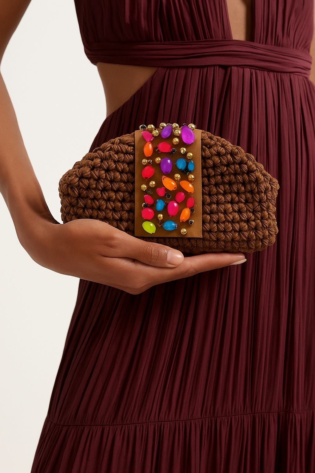 Step into bold elegance with the *Neon Mirage Clutch*, a striking handmade piece that merges artisanal craftsmanship with electric energy. This unique clutch is meticulously hand-crocheted using rich, earthy-toned raffia, cotton yarn, creating a warm and textured base that speaks to natural beauty.