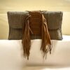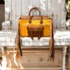 – *Decoration:* A standout feature is the *oversized handmade embellishment* on the front — shaped like a palm explosion. It’s adorned with *vibrant, electric-hued acrylic crystals* in neon yellow, pink, orange, purple, and blue, accented with jeans and genuine leather tassels details.